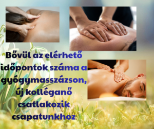 Az Egészségház gyógymasszázs szolgáltatásának időpontjai kibővülnek, valamint : csapatunkhoz egy új gyógymasszőr kolléganő csatlakozik. Több időpontban válik elérhetővé ez a népszerű és hasznos kezelés.